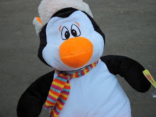 Harold, the stuffed penguin we won on the Mighty Midway playing my all time favorite midway game. It's the horse racing one where you roll the golf balls up the ramp. I used to be a child phenom at that game. :-)